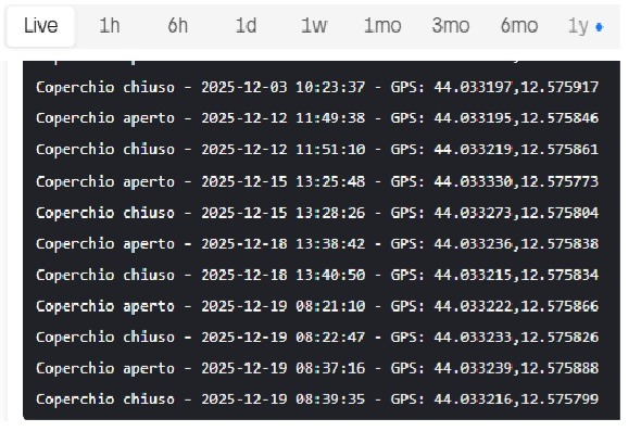 Variazioni del livello, eventi di apertura del serbatoio, posizione, immagini.